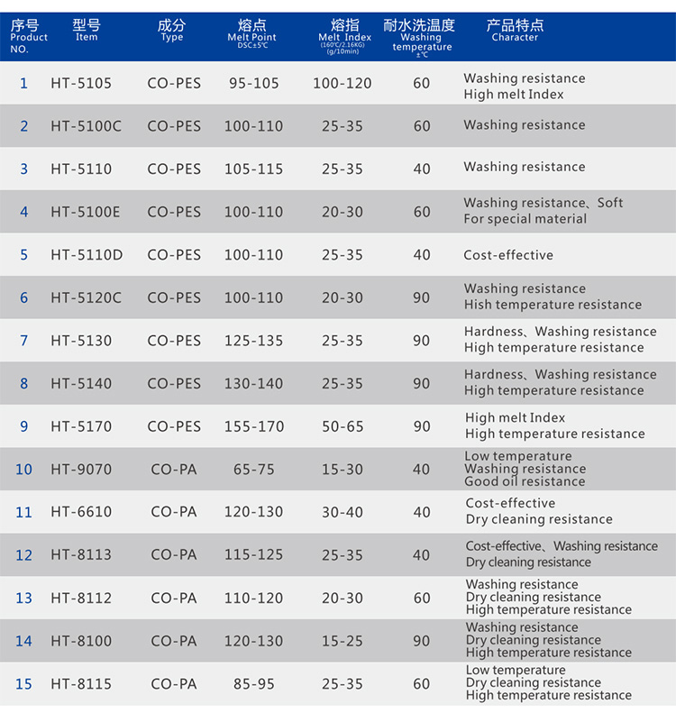 Colored hot melt adhesives COPA, COPES two series of products, suitable for products and industries with special color requirements. Widely used in clothing accessories, home textiles, packaging materials, shoe materials composite, cloth zipper and other fields. It has excellent bond strength to the bonding material and excellent dry cleaning resistance, water wash resistance, and is not easy to fade and fade.
