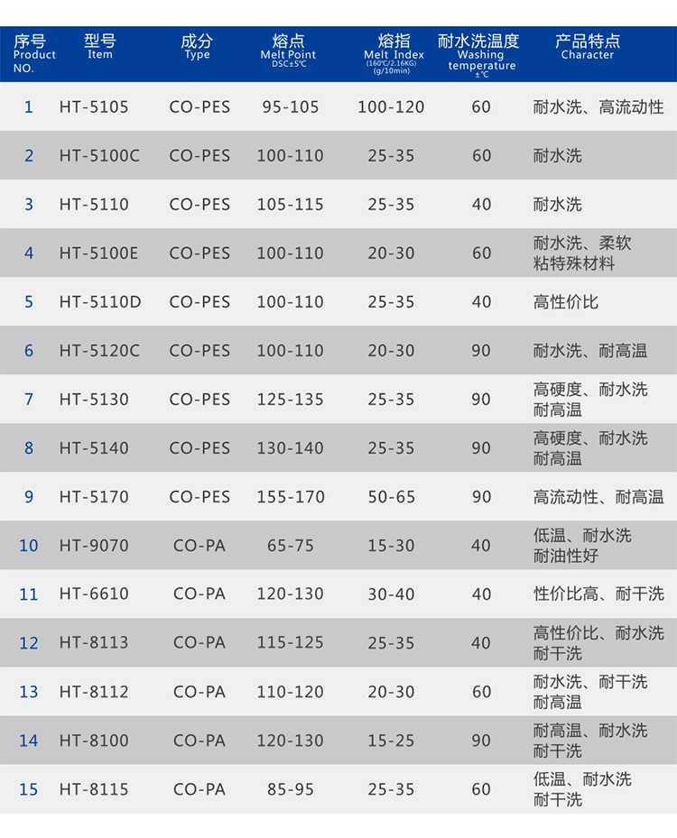 共聚酯热熔胶颗粒通过热熔涂布、热熔喷涂、热熔流延等工艺来生产热熔胶平面膜、网膜及热熔胶带。广泛应用于拉链布胶、包装材料、反光材料、汽车工业、家用纺织、装饰材料、过滤材料等领域。